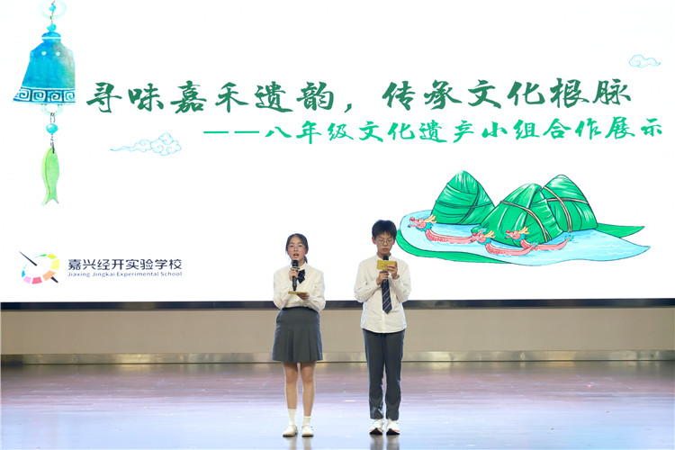 南湖、大运河、五芳斋粽子、新塍糕点、蓝印花布……我们身边有很多遗留下来的名胜古迹、民间技艺、艺术形式、民俗活动等,都彰显出独特的人文价值,凝聚着共同的历史记忆,是宝贵的文化遗产。2023年4月28日下午,我校在致远楼三楼报告厅举办“寻味嘉禾遗韵,传承文化根脉——记八年级文化遗产小组合作展示”活动。活动由陆歆琳和商天奇同学主持,八年级全体师生到场。