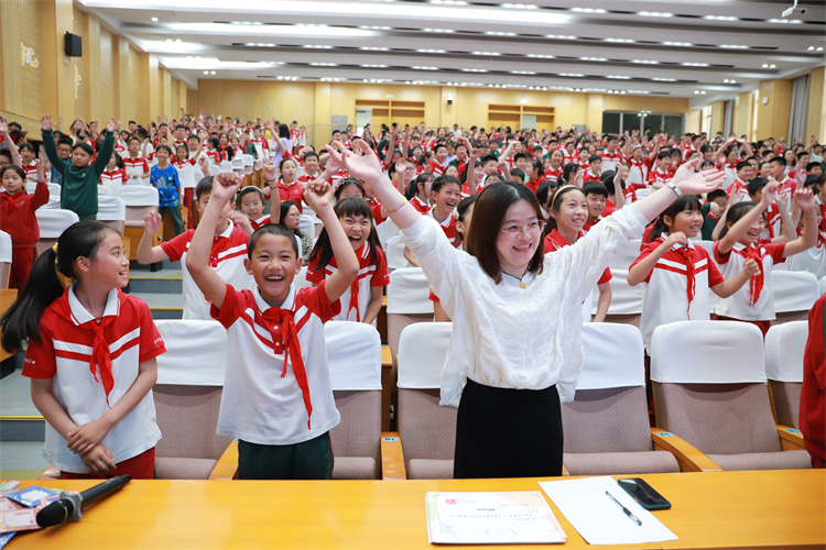 在主持人陈晖老师和408班徐诚茂同学的热情宣布下,参与知识竞赛环节的小选手们稳步入场。他们都是由各班学生共同推选产生,四、五年级合作组队的形式能让不同年级间的同学互学互助,更好感受学习的梯度,体会合作的力量。