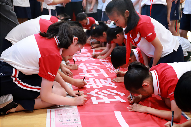 为了响应教育部六不准的号召,全面落实省、市、区防溺水安全工作文件精神,提高我校学生预防溺水的安全意识和安全技能,减少溺水事故的发生,6月5日早上的升旗仪式上,嘉兴经开实验学校举行“同心防溺水,全力护成长”的防溺水周启动仪式和学生签名活动。