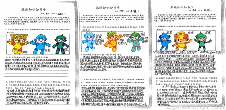 亚运会是一场拼尽全力的体育盛事,同学们通过各种方式学习亚运知识,了解亚运吉祥物的来源,搜集自己感兴趣的赛事,了解赛事规则。一笔一划间,是同学们对亚运的憧憬,一闻一问中,是对祖国的热爱。