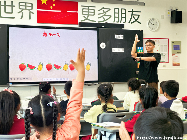 23日上午第一节是由朱煜超老师和103班孩子们给我们带来的《找规律》。朱老师根据一年级小朋友的认知特点,以闯关探密码为教学情境。从学生熟悉的颜色和小动物入手,在读的过程中“找规律”;第二层次再在读的过程中尝试分一分或圈一圈,引导学生圈出规律,说好规律,会用自己的方式表达规律。最后一个层次是创造规律,学生根据前面的学习经验用不同方式表达了这个规律,最后闯关成功,获得密码。