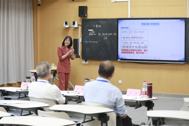来自嘉兴经开实验教育集团的许灵嘉老师在展示数轴一课时展现了出色的教学技巧和管理能力。她不仅能够巧妙地控制课堂节奏,还能够以引人入胜的方式引导学生深入理解数学概念。在课堂上,许老师以温度计作为切入点,生动地引出了数轴的概念,清晰地阐述了数轴的定义,并通过丰富的例题进行深入分析。在说课环节,许老师将教学目标和策略融入到师生互动和认知过程中。她深入剖析了本节课的设计意图,让听众对整个教学过程有了更清晰的认识。她的说课不仅是简单的教学介绍,更是对教学理念和方法的深入阐述。