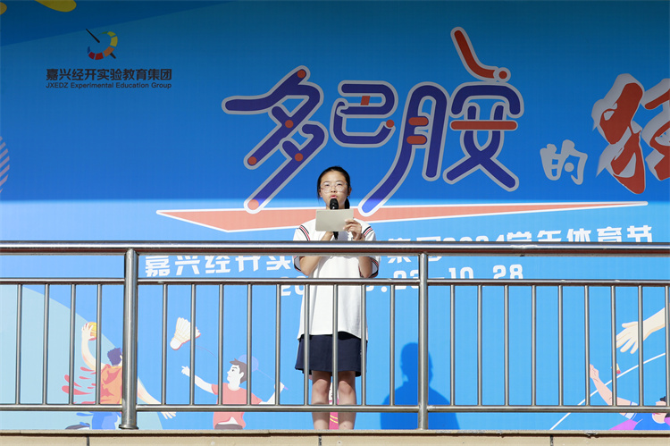 嘉兴经开实验教育集团副总校长徐小英在开幕式致辞中表达了对体育运动的热爱,并鼓励师生们在运动中寻找快乐、收获成就。她宣布体育节正式开幕,标志着这场多巴胺的狂欢正式启动。