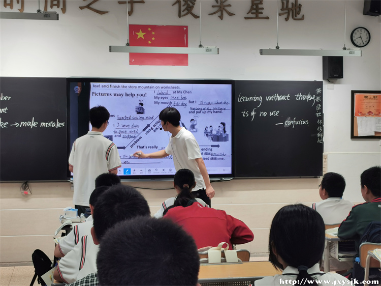 活动的第一阶段是孙新阳老师执教外研版Unit 1 The first lesson 一节新教材实验课。他以新生签名墙照片和Do you remember your first lesson at junior high?导入第一课话题。学生积极发言,潜在的有关the first lesson 知识储备被激发。接着孙老师以who,what等问题为起点,帮助学生读the first lesson 插图,知道Learning without thinking is of no use。学生借着sentence, mistake,Confucius,慢慢走进了文本。接下来孙老师设计了两个亮眼的整读环节:what happened in the first lesson和put the sentences in order。同时在整读过程中,孙老师处理了生词和重点短语。在生词铺垫顺利完成后,学生通过仔细阅读,在文本中成功捕获关键信息。拥有了这些基础台阶,学生顺利掌握了这些词汇,并且在后续环节中成功输出。再接下来,孙老师设计了the story mountain,通过beginning, problem, rising action, climax, falling action和ending过程,引导学生与文本交流。学生在孙老师的引导下,融进了文本,与主人公Wang Han情绪共振,体会到worried到nervous,再到happy的整个过程。最后孙老师以有意留在板书上的mistakes引导学生给教师纠错。学生也找出了全部错误,把文本的核心思想learning without thinking is of no use落到了实处。