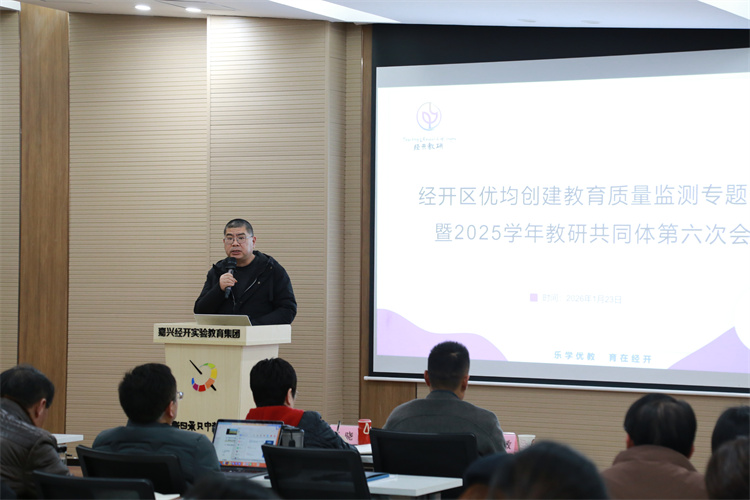 为确保 2026 年上半年南湖区优均创建测评顺利通过,扎实推进区域教育质量提升与优质均衡发展,2025 学年,嘉兴经开区在经开实验教育集团召开优均创建教育质量监测专题培训会,同时这也是该区教研共同体第六次会议。区民生事业部相关领导、教研指导中心全体成员、教研室全体成员,城南长水街道各分管中小学校长、教务主任及教育督导条线专职督学等参加会议。会议由经开区民生事业部教研室仲明亮主任主持。