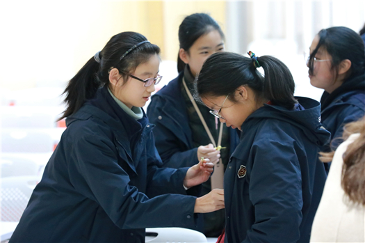 活动伊始,七、八年级志愿者结对而坐,由八年级的志愿者们为新加入团队的七年级志愿者佩戴徽章。看似简单的举动背后,却是一份爱与责任的传承。